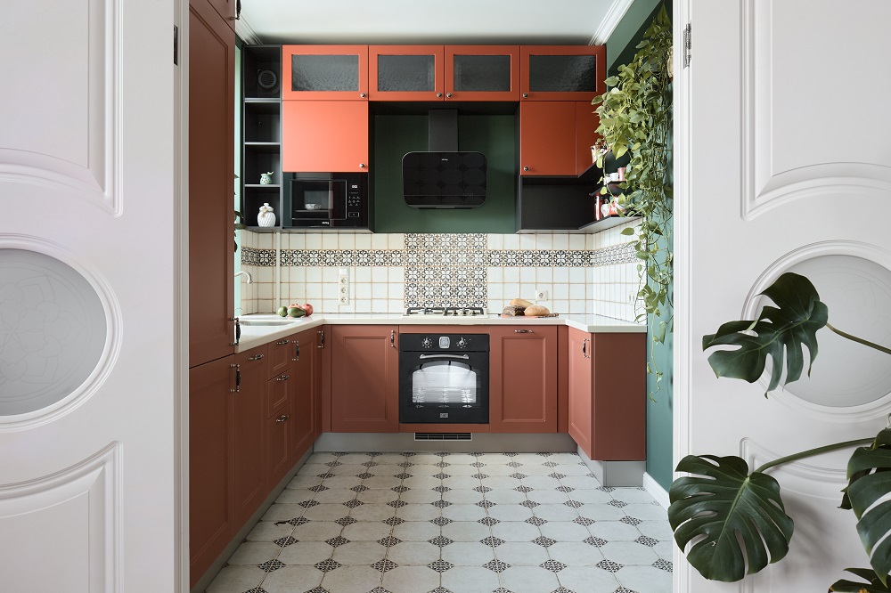 Конформизм — это точно не про эту кухню. В ней объединились модернистские гладкие фасады яркого мандаринового оттенка и классические фасады с фрезеровкой холодного оранжевого цвета. Чтобы такая комбинация получилась гармоничной, нужно обладать не только смелостью, но и абсолютным чувством вкуса. Гордимся, что клиенты бренда «Кухонный Двор» не боятся нестандартных решений!